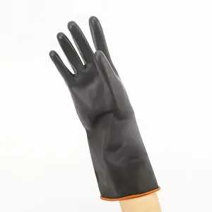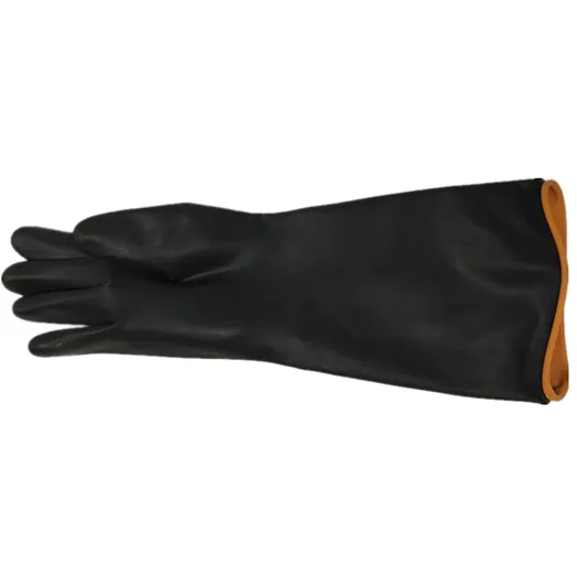 قفازات صناعية طويلة مصنوعة من المطاط الصناعي المتين، توفر حماية فعالة لليدين والساعدين من الأحماض، القلويات، والمواد الكيميائية المختلفة. مثالية لمهام التنظيف، الصيانة، والعمليات الصناعية التي تتطلب حماية من السوائل الكيميائية.